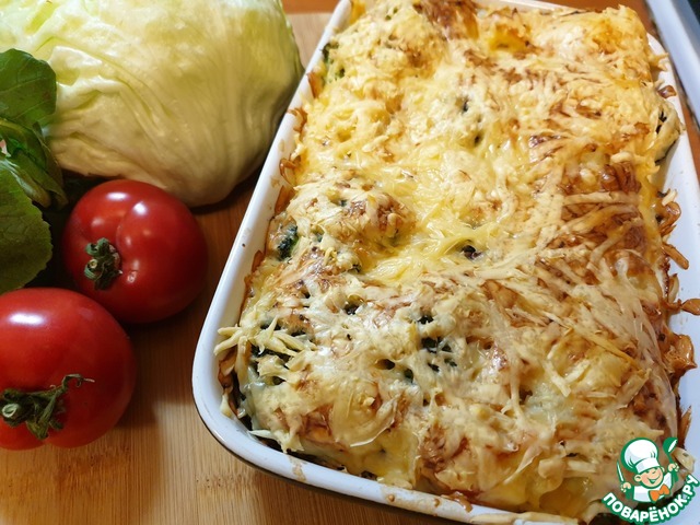 Смажьте форму (у меня размер 15х21 см) для выпечки маслом и выложите капусту.