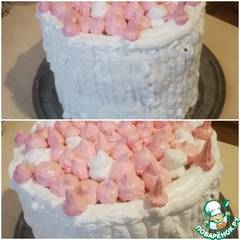 Для оформления охлажденные сливки взбить с сахарной пудрой. Обмазать бока и верх торта. Украсить по желанию. В моем случае я обмазала бока сливками, а поверху нанесла узор насадкой "листик".