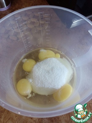 Для каждого коржа 4 яйца взбить со 150 г сахара до увеличения в объеме в несколько раз.