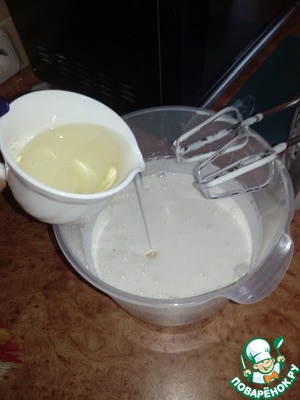 Когда масса станет практически однородной добавить размягченное сливочное масло. Все хорошенько взбить.