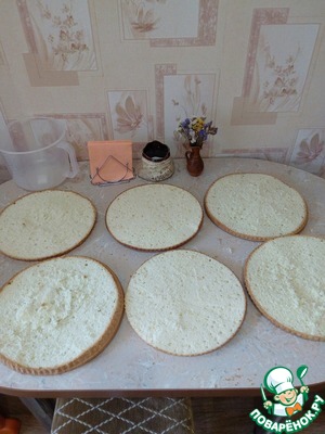 Вот такая стопочка коржей получилась. Я обычно пеку накануне вечером, чтобы они постояли около суток в спокойном состоянии. Это необходимо для того, чтобы бисквит можно было разрезать и пропитать кремом. Тогда он не крошится и при пропитывании не развалится.