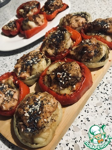 На силиконовый коврик выкладываем кольца овощей, и наполняем начинкой. Тут можно схитрить- в крупные кольца перца я ставила маленькие колечки лука, и заполняла фарш в них (например горбушу внутрь колечка, зубатку вокруг).