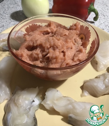 Рыбу филируем. Поскольку зубатка очень нежная рыба, я ее не перемалывала, она у меня тонкими полосочками. Фарш солим, перчим.