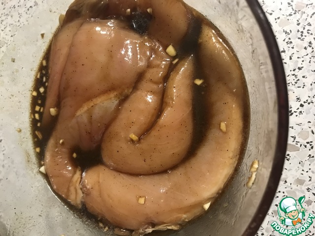 В таре все смешиваем, и каждое подготовленное филе как следует обмакиваем в маринаде (особенно внутри).