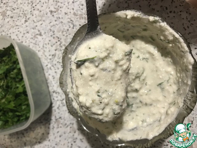 Зелень и чеснок рубим мелко. Смешиваем с творогом и специями. -