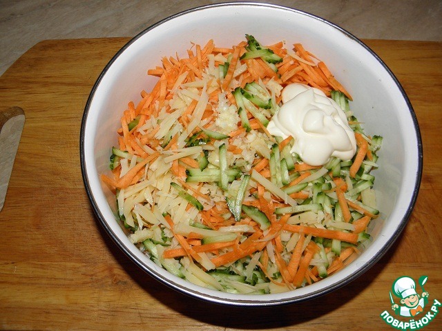Морковь, огурец и сыр натереть на терке (лучше на корейской, если такой нет, то на обычной крупной)