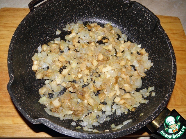 На масле пассеровать лук, добавить грибы (у меня белые, поэтому я их предварительно отварила, шампиньоны можно сразу с луком обжаривать)