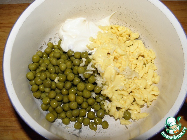 В чашу блендера складываем сыр, чеснок, горошек (без жидкости) и майонез
