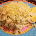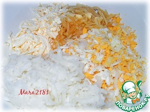Можно оставить половинку от одного яйца, чтобы в конце использовать для декора. Остальные заранее сваренные вкрутую яйца натереть на крупной тёрке.