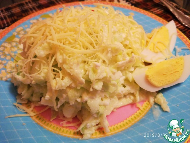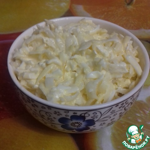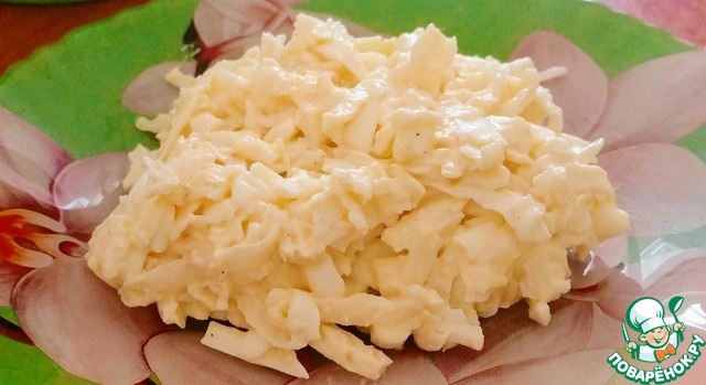 Теперь с дайкона слить выделившийся сок. Соединить все подготовленные ингредиенты салата вместе: дайкон, плавленный сырок, яблоко, яйца. Перемешать.