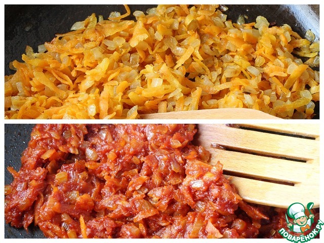Лук обжариваем на растительном масле до светло золотистого цвета, добавляем морковь и обжариваем на малом огне почти до мягкости. Добавляем три столовых ложки томатной пасты, перемешиваем и тушим 5 минут.