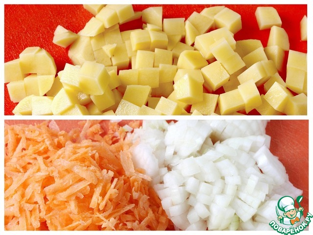 Картофель режем кубиками. Лук режем мелко, морковь натираем на длинной терке.