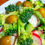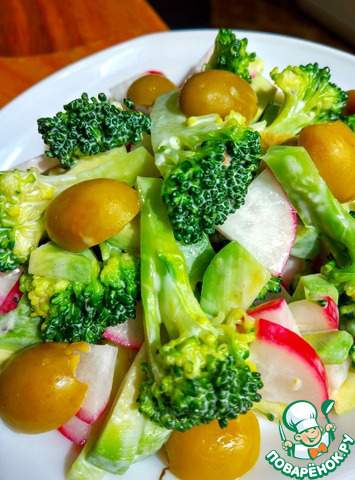В миску положить брокколи, салатные листья, редис, зелёный лук. Полить соусом, посолить и поперчить.