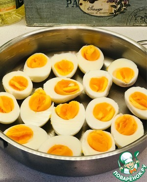 Форму смазать сливочным маслом. Яйца выложить срезом вверх. -