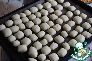 Разложить "подушечки" на противень. Накрыть тканью и оставить для расстойки до увеличения в объеме в 1,5 - 2 раза.