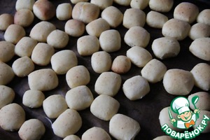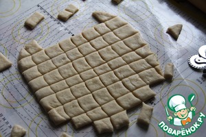 После приготовления теста, несколько раз его ударить, для удаления воздуха. Раскатать в пласт, не тоньше 1 см! нарезать ножом для пиццы на кубики со стороной около 2 см.