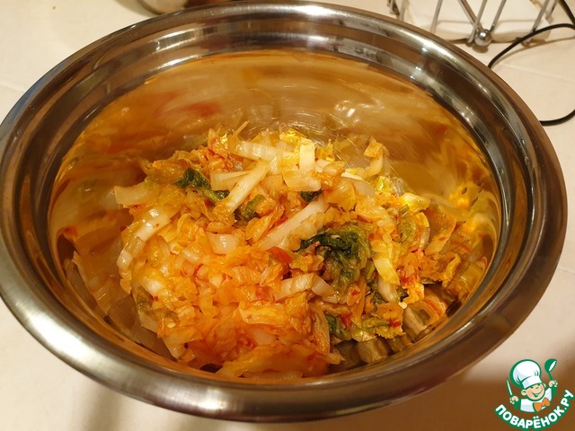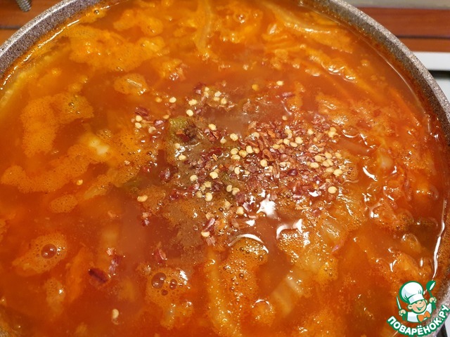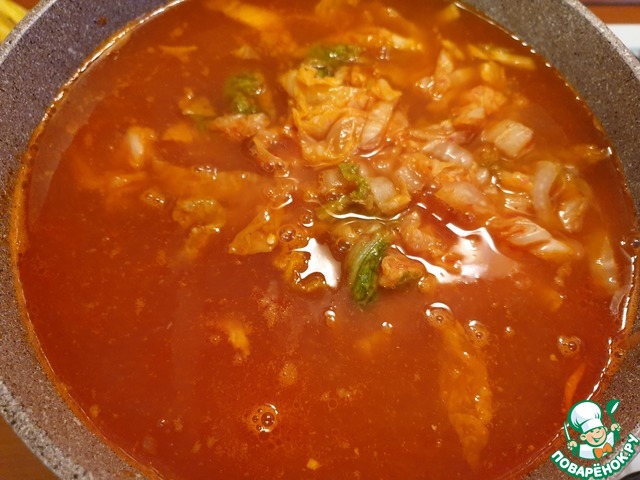 После того, как вы освободили бульон от лишнего жира и довели мясо до мягкости, положите в бульон зажарку и капусту кимчи. Доведите до кипения и варите еще 10 минут.