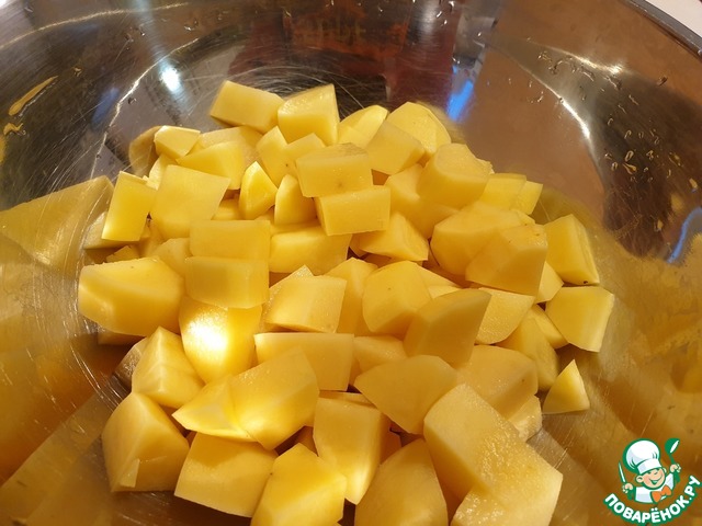 Картошку почистить и порезать крупным кубиком. Положить в суп. Довести до кипения. Варить до готовности.