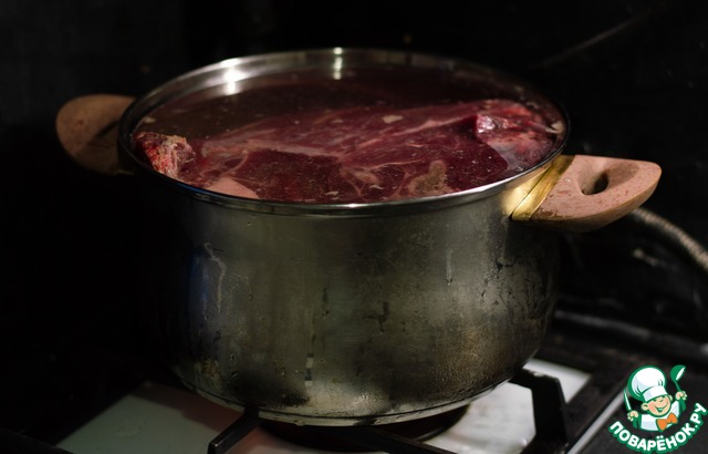 - Говядина (Самый главный ингредиент - хороший кусок постного жилистого мяса на кости. Лучше на трубчатой, самый лучший результат выходил если взять поперечный срез коровьей ноги. Причём если его предварительно оставить в соли и холоде на два-три дня - получалось вообще наиболее достойно и главное не съесть мясо до приготовления супа.) — 2000 г