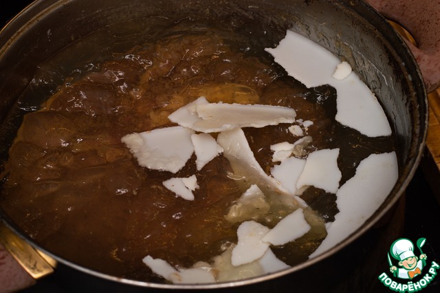 Достаём. Жир выступит этаким ледником на поверхности - если берём нежирное мясо, его будет немного, но для наших целей хватит. Вот ложкой или прямо руками его снимаем и откладываем в мисочку. Если мясо сильно жирное, или мы хотим таки добавить бекон - можно в мисочку положить часть жира, а часть жира выкинуть. Но выкидывать еду мы не любим, так что сами предпочитаем просто брать нежирное мясо и не добавлять всяких беконов.