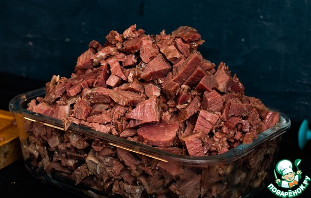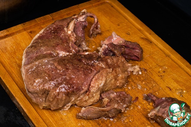 Вынимаем мясо и освобождаем от всяких перепонок и костей. Это кстати можно делать прямо руками, наше изначально жилистое и безумно жёсткое мясо после нескольких часов варки будет очень мягкое, и нежное, легко отламывается от костей.