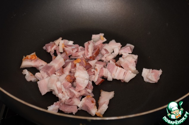 В сковороду или в казанчик - тут полезно иметь именно такую высокую и круглую форму, но в сущности, подойдёт любая - кидаем тот самый жир. с бульона. Можно добавить бекон или грудинку для того чтобы придать супу лёгкий аромат копчёности, но увлекаться не советую, смысла особого нет, мы готовили и так и так. Включаем огонь.