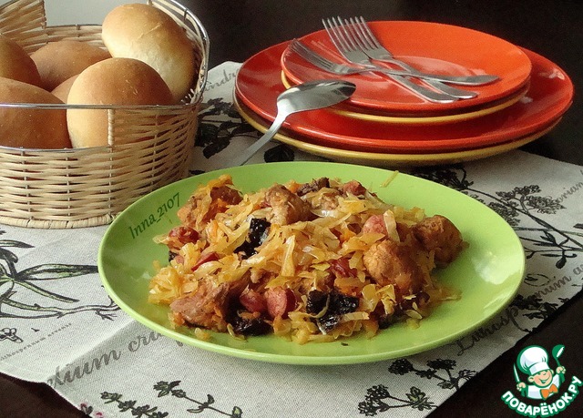 Хочу предложить вашему вниманию рецепт бигоса. Бигос - это традиционное польское блюдо. Мой вариант приготовления - с мясом свинины и охотничьими колбасками. Строгого количества продуктов в рецепте нет и, конечно, можно изменить немного состав на свой вкус, но неизменными ингредиентами в рецепте являются квашеная и свежая капуста.
