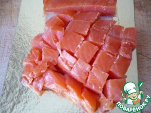 Для приготовления рыбного мусса мелко нарежьте форель холодного копчения.