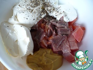 В миску для взбивания выкладываем нарезанную рыбу, сметану, творожный сыр, горчицу (лучше взять зерновую, она более мягкая, чем острая классическая), поперчите по вкусу.