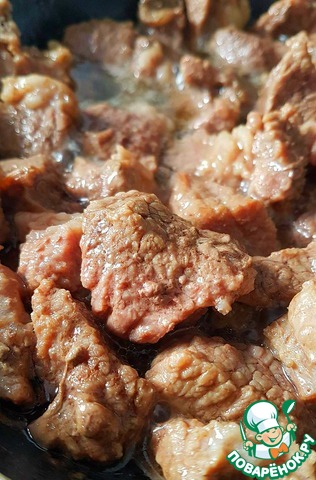 Мясо нарезать небольшими кусочками. В сковороде с высокими краями или в кастрюле с толстым дном тушить мясо до готовности на медленном огне. В процессе приготовления доливать чуть кипятка, чтоб мясо не пригорело.