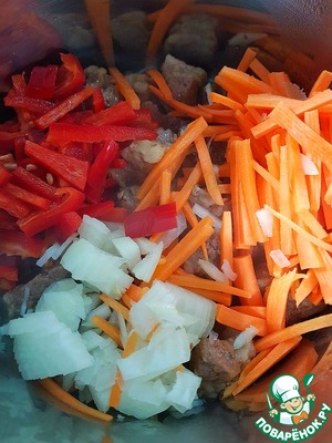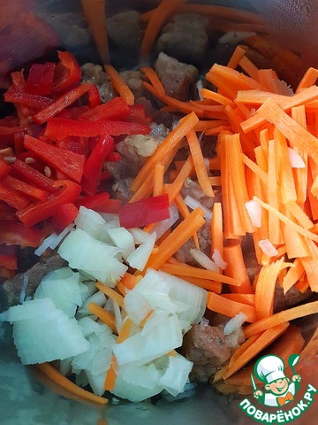 В кастрюле на небольшом количестве растительного масла пассеровать лук, морковь и перец... а далее всё по рецепту.