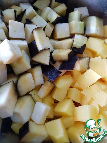 Добавить нарезанные кубиками картофель и баклажаны. (На этом этапе картофель можно вовсе исключить и в следующем шаге использовать побольше фасоли). Баклажаны по желанию можно предварительно очистить.