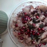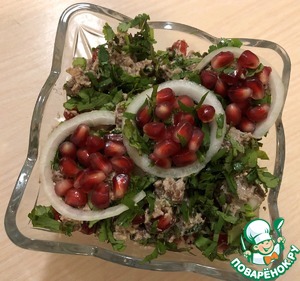 Хорошо промытую свежую кинзу нарезать, гранат разобрать на зёрна