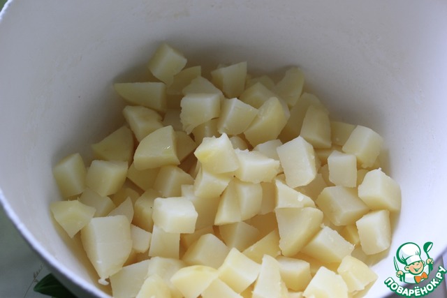 Картофель отварить в кожуре до готовности, остудить, очистить и нарезать кубиками.