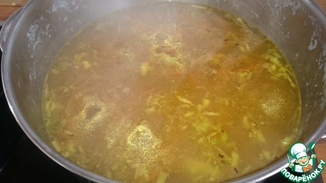 И ставим на плиту вариться. Количество воды указано для густого супа, регулируйте под свой вкус.