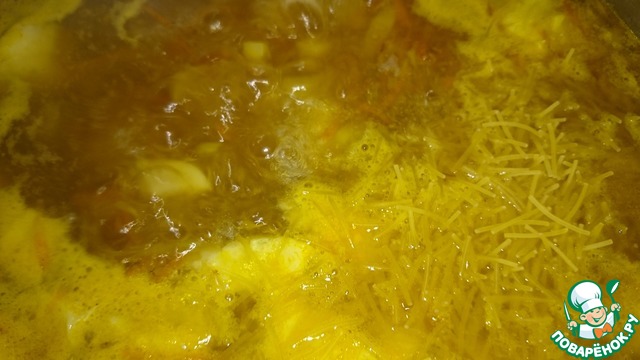 Добавляем горсть вермишели, перемешиваем и варим еще 3 минуты.
