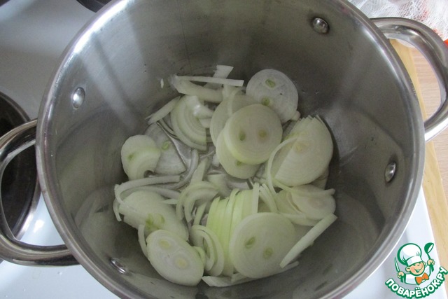 Ставим кастрюлю на средний огонь, наливаем растительное масло и всыпаем лук. Готовим, помешивая, 4-5 минут.