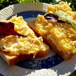 Взять подготовленный хлеб. Ту сторону, где не было обжаривания, намазать тонким слоем майонеза с чесноком, обмакнуть промазанной стороной в тeртый сыр, сверху посыпать смесью яйца и зелени.