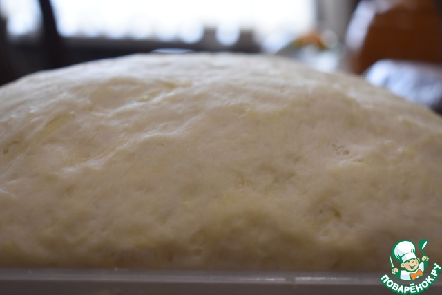 Я тесто заводила опарным способом. В приятно теплые молоко 125 мл + 75 мл воды развести сахар и дрожжи, вмешать 150 г просеянной муки. Поставить в теплое место ориентировочно на 25-30 мин. При увеличении опары в 2 раза, начинаем заводить тесто.