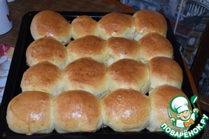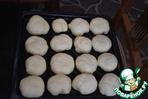 Делим тесто на 8 равных частей, я количество продуктов увеличила в 2 раза, поэтому 16 булочек. Формируем кругленькие булочки, выкладываем на противень, смазанный растительным маслом, накрываем полотенцем и оставляем в покое на 25-30 минут. Духовку разогреваем до 200 градусов. Размешиваем яйцо со столовой ложкой воды. Смазываем подошедшие булочки льезоном и отправляем в духовку. Через 7 минут смазываем их оставшимся льезоном и отправляем в духовку на 15-20 минут до золотистой аппетитной корочки сверху.