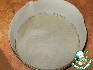 Затем подготовим форму. У меня форма диаметром 26 см. Дно застелить пергаментом. Бока можно застилать, а можно и нет... Я застилаю, так как форма у меня уже старенькая и не хочу, чтоб тесто соприкасалось с металлом!
