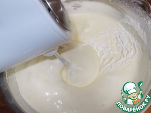 Затем во взбитые яйца вводим муку смешанную с ванилином и разрыхлителем. Вводим муку в три приема, размешивая миксером на маленьких оборотах.