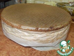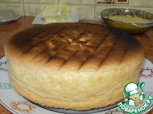 Пропитываем корж сиропом. В ГОСТовском рецепте для пропитки идет сахарный сироп сваренный из сахара и воды в пропорциях 1 к 1 (100 мл воды и 100 г сахара довести до кипения и проварить около 5 минут), но для меня это показалось сладковатым и я взяла сироп из под персиков... Он с легкой кислинкой и фруктовой ноткой, которая практически не ощущается по вкусу в готовом торте. Если же Вы решили сварить сироп, то добавьте в него немного лимонной кислоты или ложку коньяка, или ликера. Пропитывая бисквит учитываем, что он получается нежным, поэтому сильно обильно пропитывать нет необходимости...
