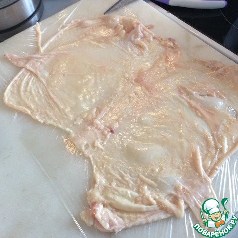Расстилаем на пленке кожу, очищенную от жира. Лишние лоскуты отрезаем на заплатки. Употребление кожи - спорный вопрос. Для деток не стоит да и сочность можно повысить нежирной сметаной, сливками 10% или ничем! Но этот батончик для взрослых. Увы, любят "с припёком" и непременно в желейной оболочке. -