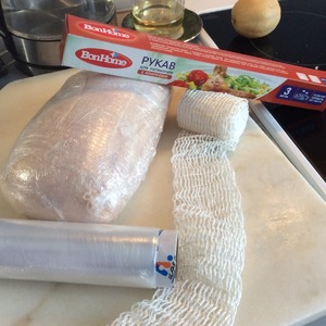 Необязательно помещать в формовочную сетку или сетчатый эластичный бинт. Однако это гарантирует особую плотность ветчине. Затем выкладываем в рукав для запекания и завязываем его очень тщательно, чтобы влага не попала к фаршмассе.