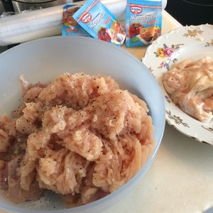 Мясо окорочков режем крупными лентами, филе прокручиваем через мелкую решётку мясорубки. Все соединяем, добавляем соль, специи, желатин в порошке быстрорастворимый, 2-3 столовые ложки сметаны выбранной вами жирности. -
