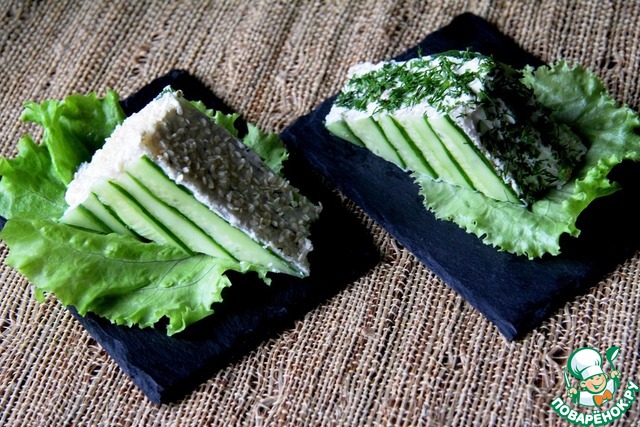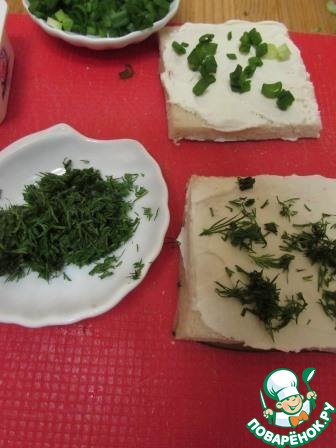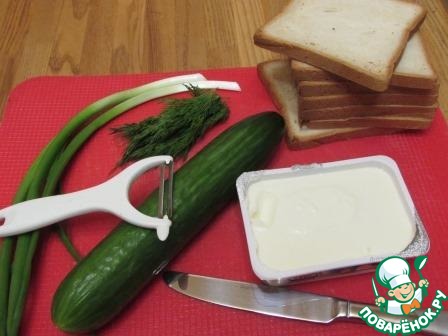Перевернуть сторону с огурцом на разделочную доску и смазать вторую сторону тостов сыром, присыпать один тост петрушкой, второй зеленым луком. Думаю, на фото всё понятно.