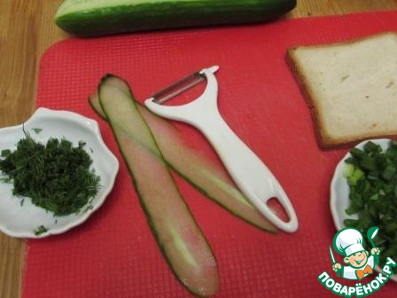 Мелко нарезать петрушку и зеленый лук. Овощерезкой огурец нарезать тонкими слайсами. Если есть овощерезка более мелкая, ещё лучше, слоев на бутерброде будет больше.