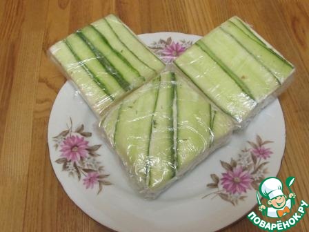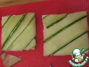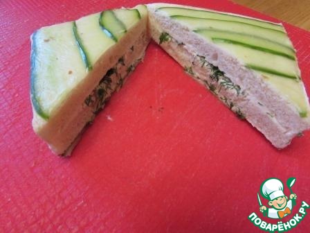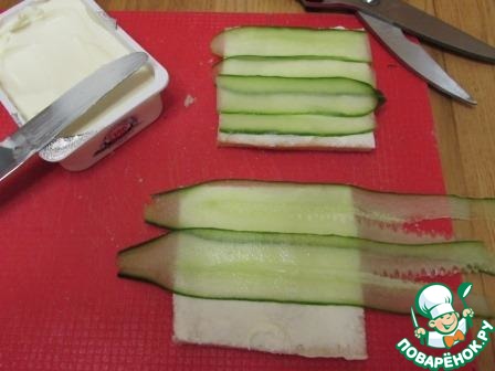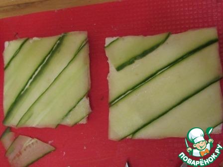 Работаем сразу с двумя тостами. Намазать сыром одну сторону тостов и выложить огурец, подровнять ножом или ножницами края.