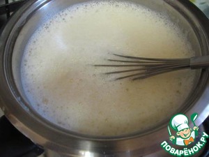 При постоянном помешивании добавить тонкой струйкой молоко, что бы бала пышная масса. Обратно вылить в сотейник.